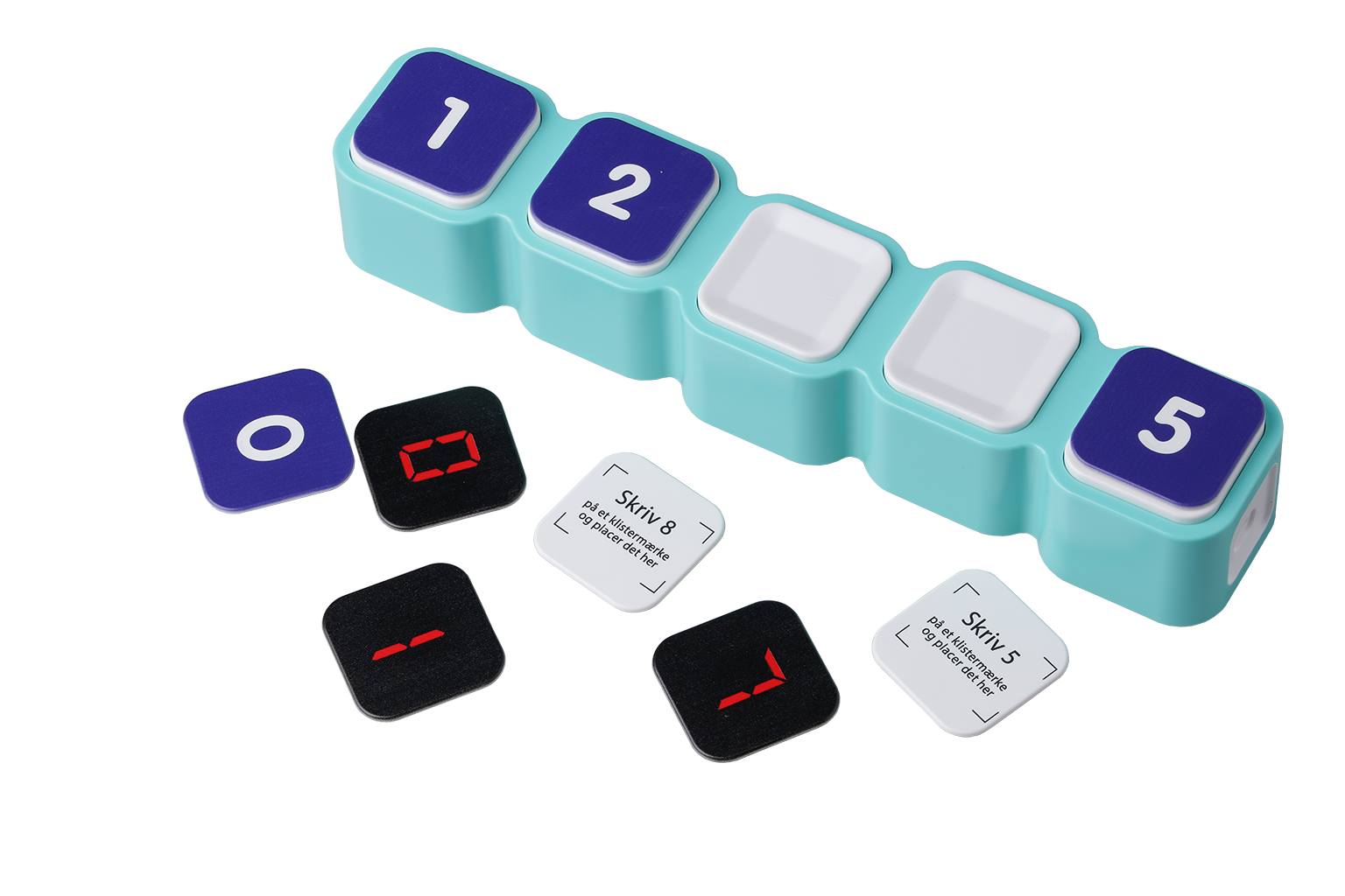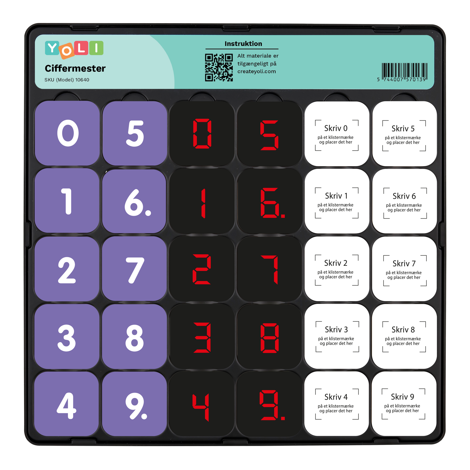 Skriv cifrene 0–9 på de hvide labels og klistre dem på de medfølgende brikker.