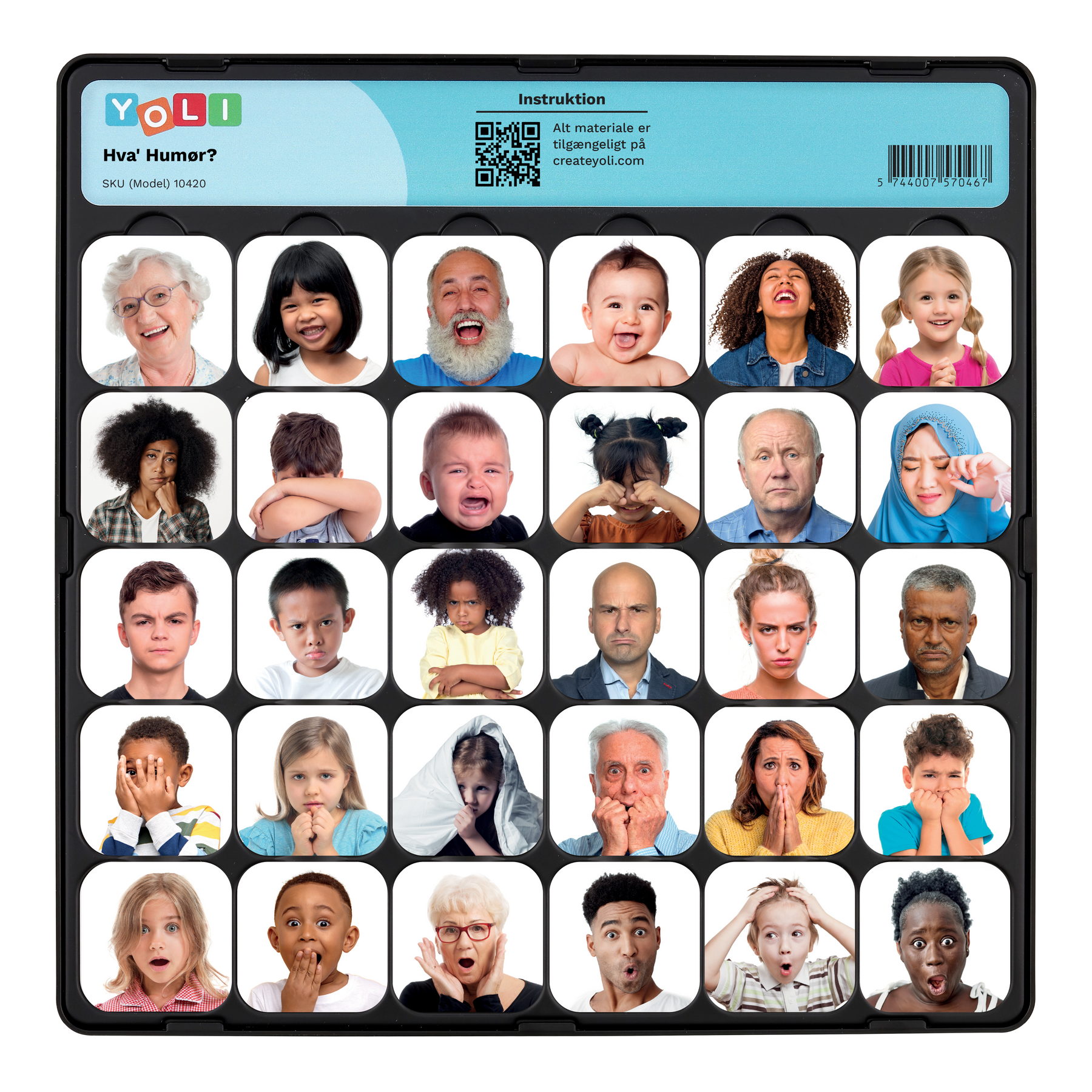 Placér en vilkårlig brik på YOLI-boardet. Børnene skal derefter finde fire andre brikker, hvor personerne viser den samme følelse: glad, ked af det, vred, bange eller overrasket.