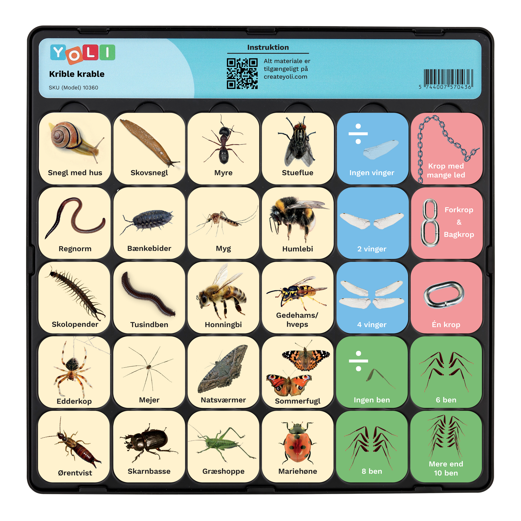 Hvor mange ben har en bænkebider? Og hvem gemmer på skjulte vinger - myggen eller sommerfuglen? I Krible krable lærer børnene at kende forskel på smådyrene, de møder i haven, på legepladsen eller i skoven.