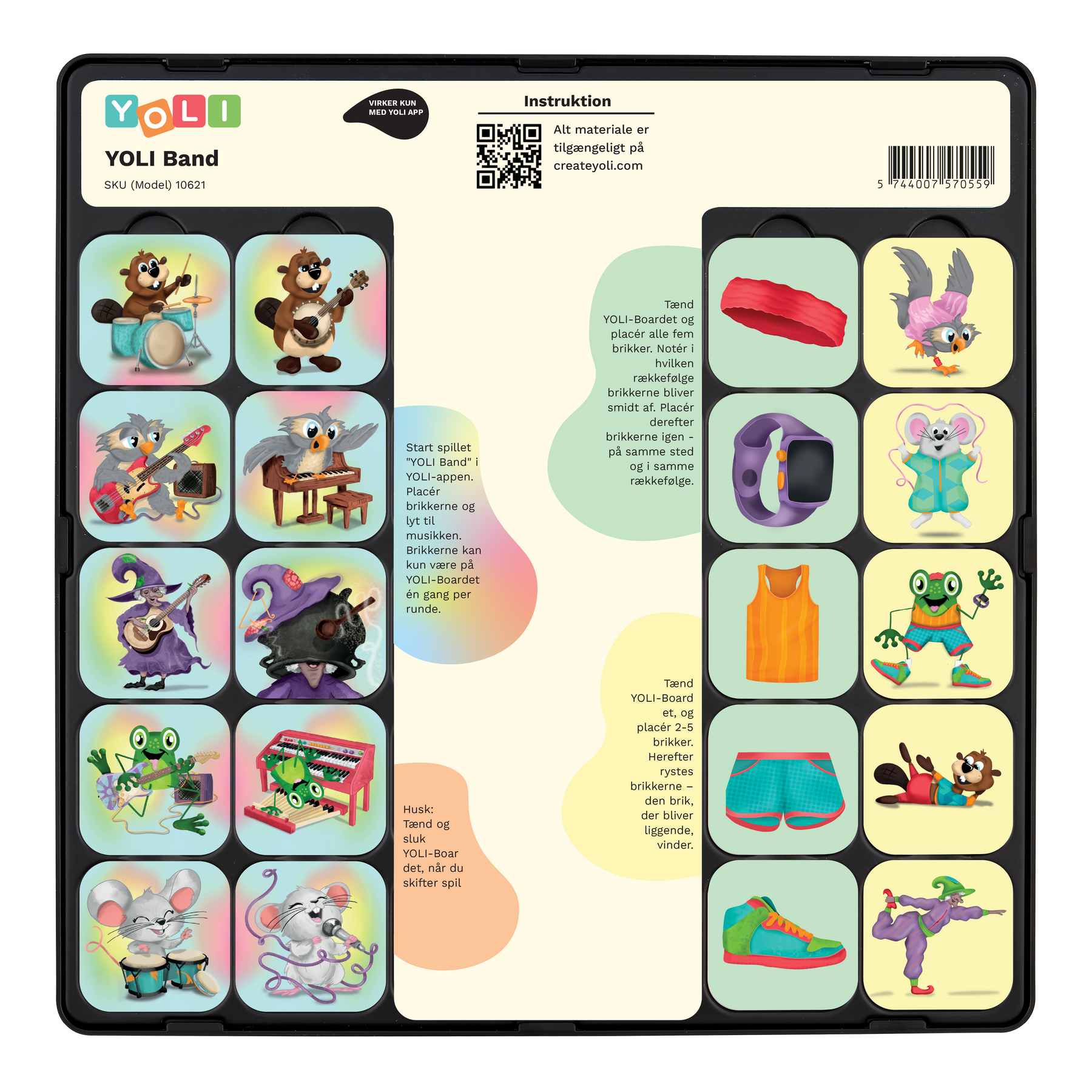 Når der er 5 brikker på YOLI-boardet, er runden færdig og du kan lytte til det samlede musiknummer. Start derefter forfra med nye brikker. Der er ingen rigtige eller forkerte svar, kun nye musikoplevelser.