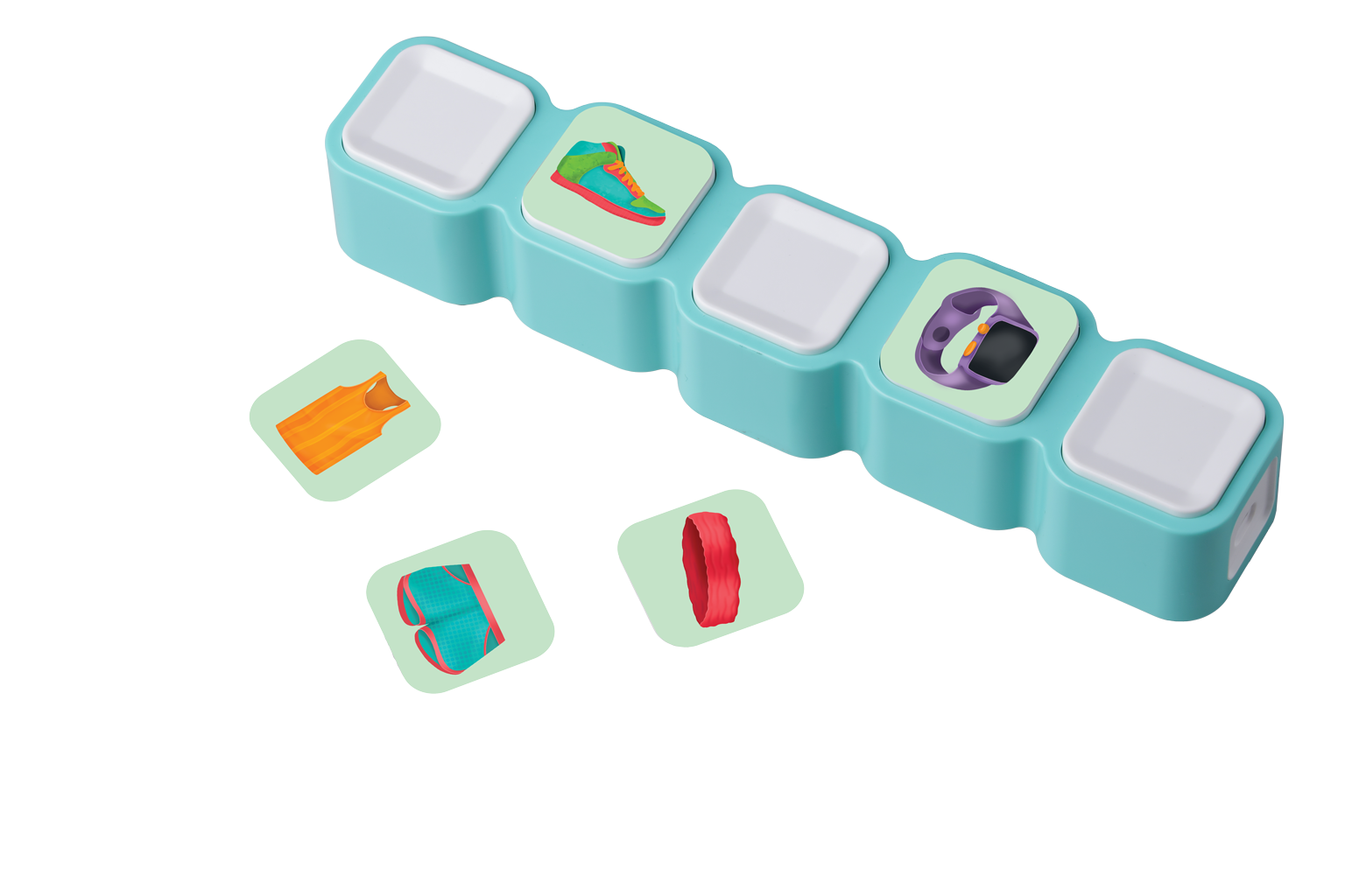 Boardet smider derefter alle brikkerne af i vilkårlig rækkefølge og børnene skal nu huske rækkefølgen og placere brikkerne korrekt igen.